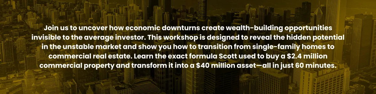 Hi, I’m Scott, and I'm bringing 23 years of experience in commercial real estate to this workshop. Throughout my career, I’ve mastered the art of finding opportunities where others see only chaos. Earlier this year, I leveraged strategic insights to acquire a $40 million office building for just $2.4 million.